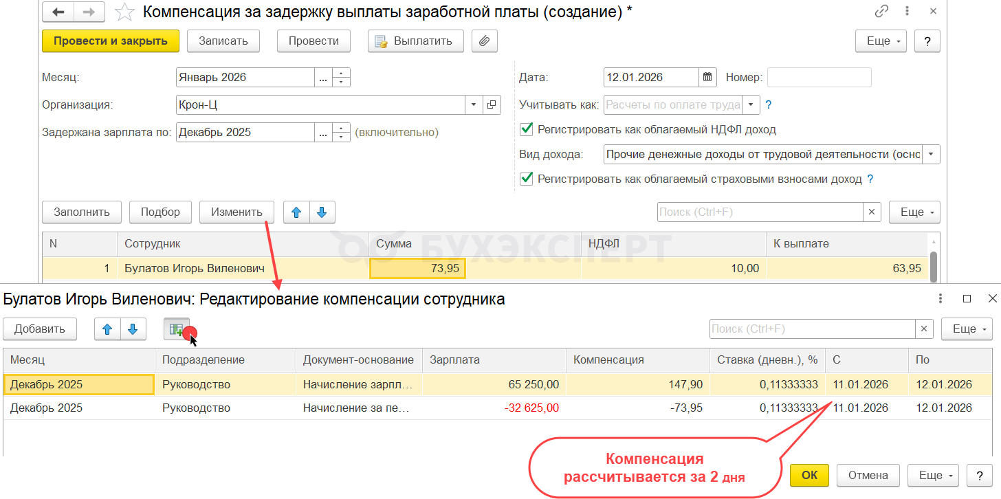Поэтому при установленной дате выплаты 10 числа следующего месяца компенсация автоматически посчитается всего за 2 дня – 11 и 12 января. Увидеть подробности расчета можно по команде Изменить и потом значку с зеленым плюсом в документе Компенсация за задержку выплаты заработной платы.