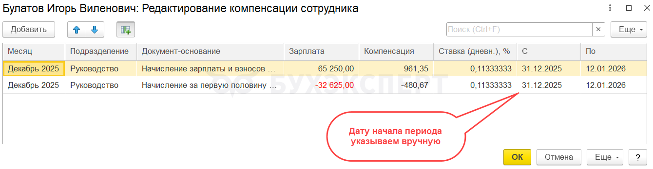 Чтобы начислить компенсацию за задержку выплаты правильно, нужно изменить начало периода компенсации. Сделать это можно вручную в форме Редактирования компенсации сотрудника. После изменения периода компенсация пересчитается автоматически.