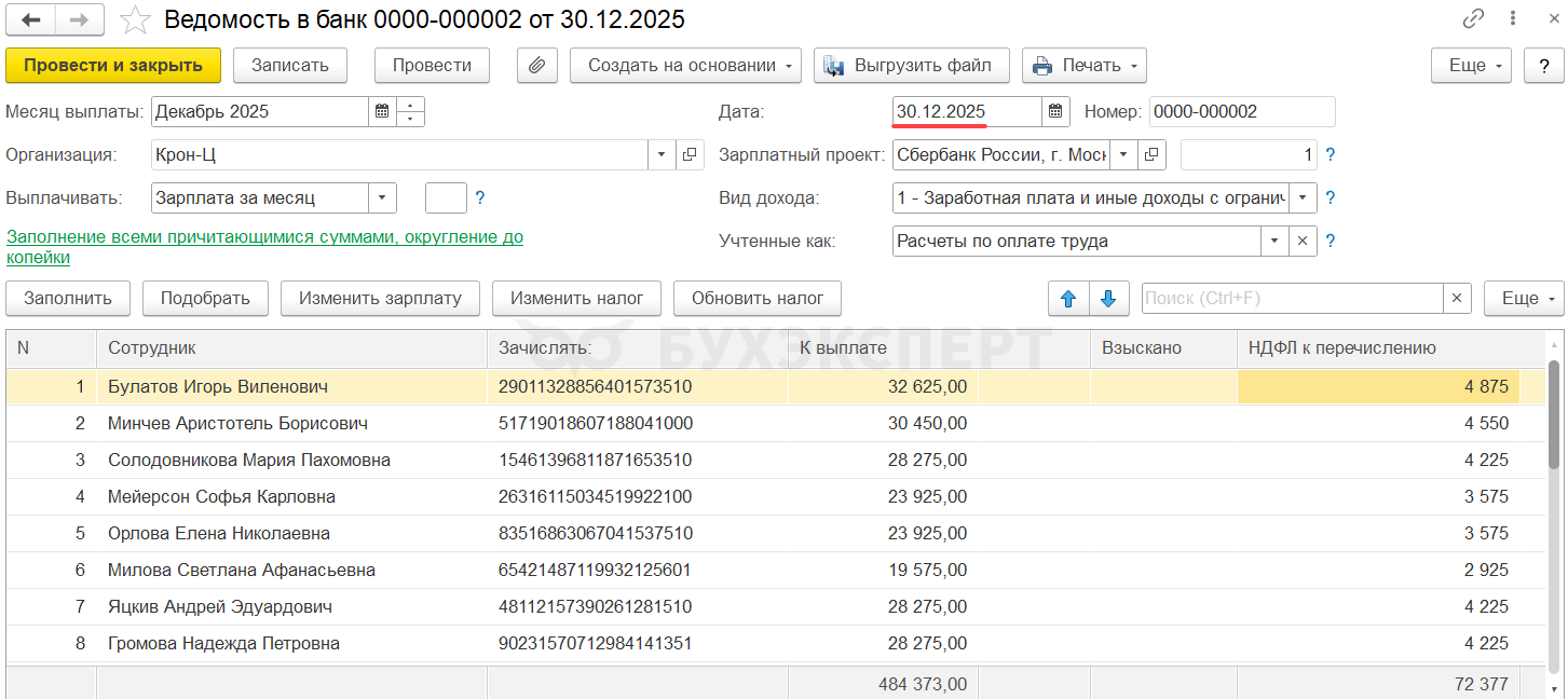 Начислим зарплату за декабрь 2025.
