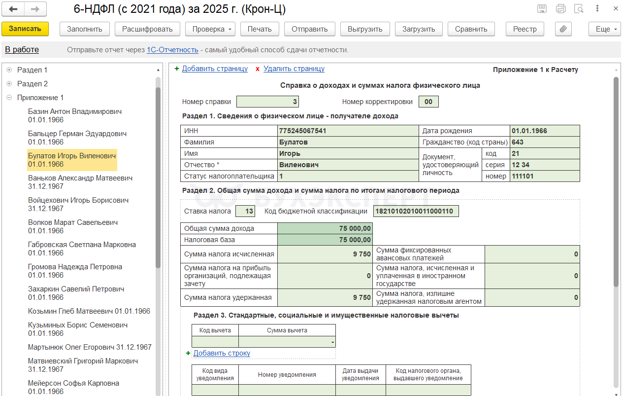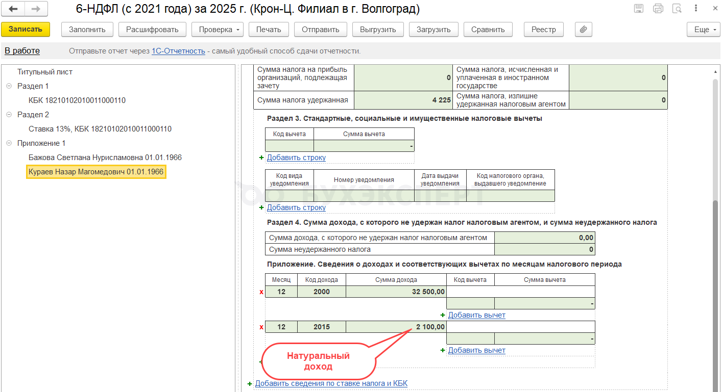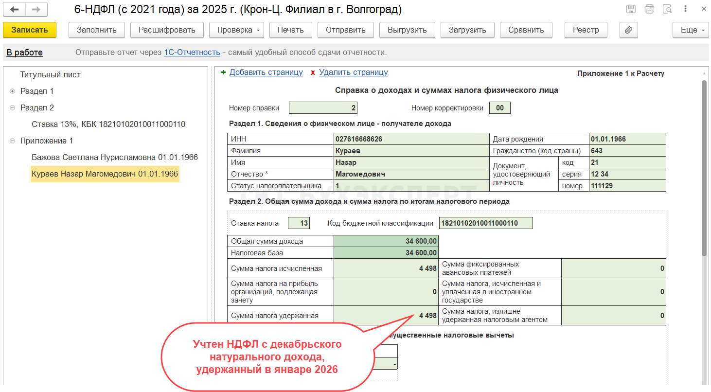 А вот Приложение 1 6-НДФЛ заполняется по другим правилам – удержанный налог мы показываем в том же отчете, в который включили исчисленный НДФЛ. Поэтому, если НДФЛ с декабрьского натурального дохода и подарка удержали в январе 2026, он все равно будет учтен в Приложения 1 6-НДФЛ за 2025 год в показателе Сумма налога удержанная.