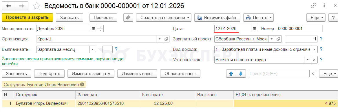 В документе Начисление зарплаты и взносов укажем планируемую дату выплаты 12.01.2025.