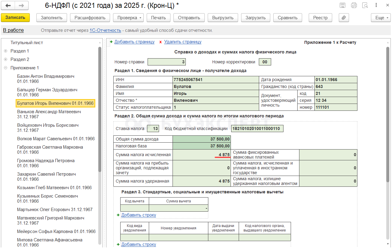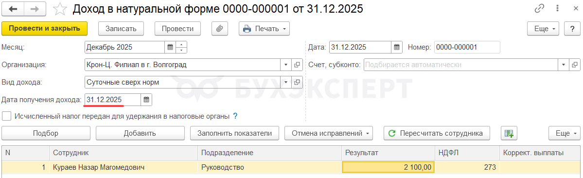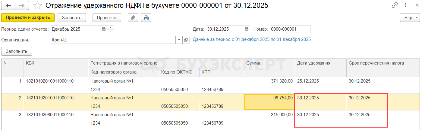 - Доход и исчисленный налог в учете НДФЛ будут отнесены к 2025 году