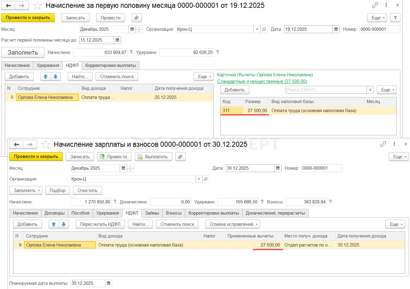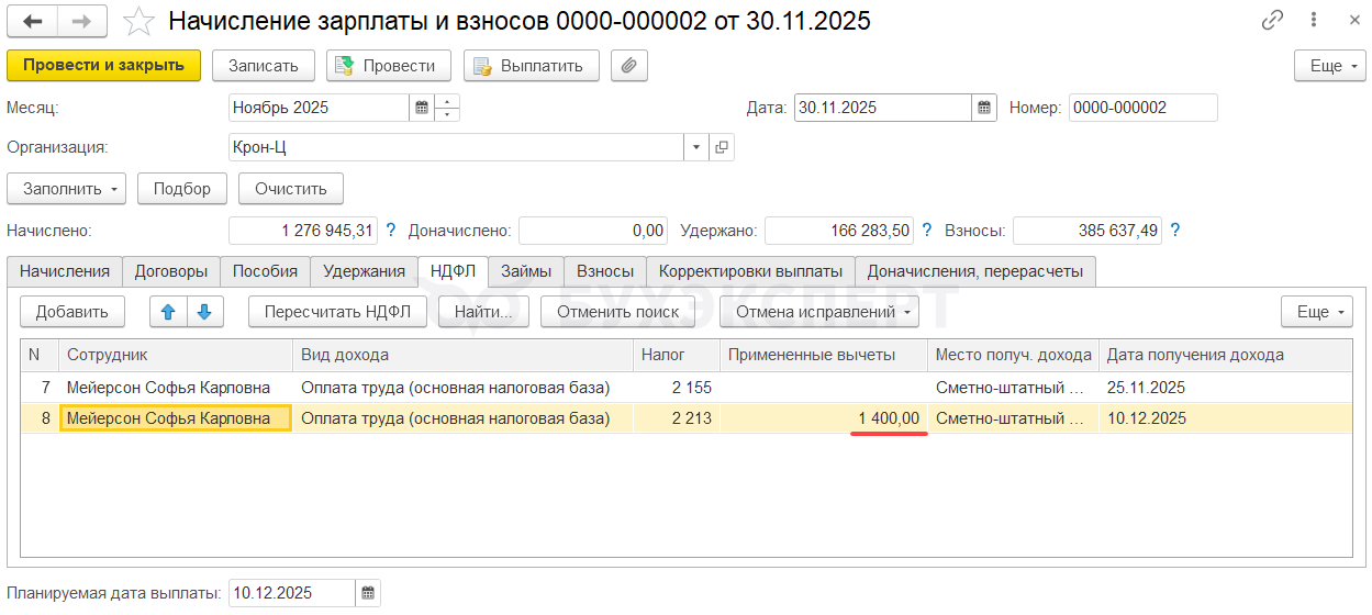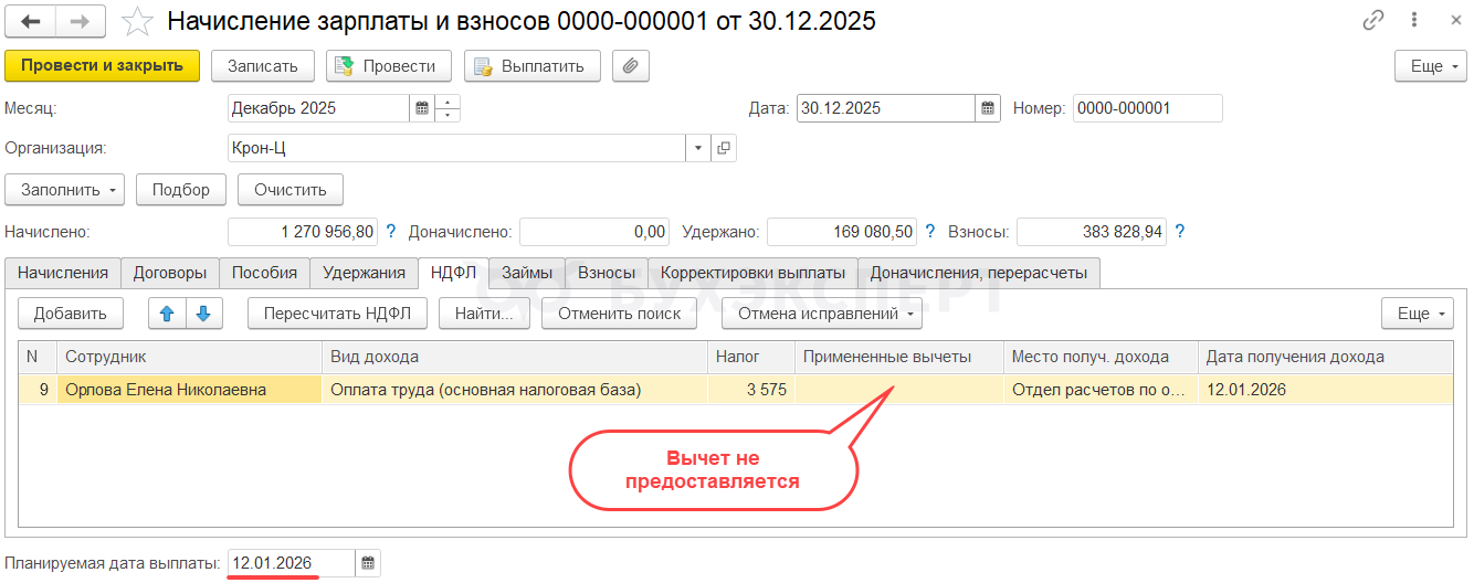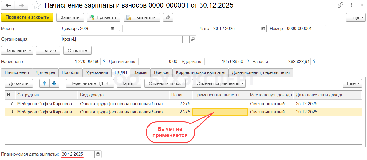 Если расчет налога с декабрьской зарплаты выполнен на дату получения дохода 30.12.2025, Мейерсон С. К. не будет предоставлен стандартный вычет. Вычет за декабрь уже был предоставлен при выплате ноябрьской зарплаты. А права на январский вычет не возникает, т. к. зарплата за вторую половину декабря относится в учете НДФЛ к декабрю 2025.