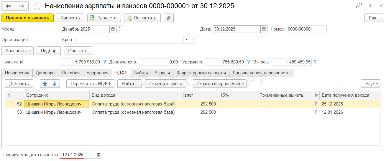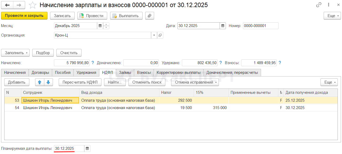 Сотрудник Шишкин И. Л. принят на работу в декабре 2025, но зарплата за месяц у него большая – 4,5 млн руб.: