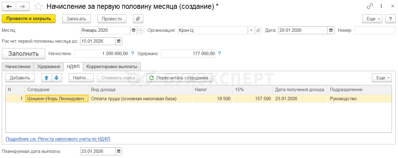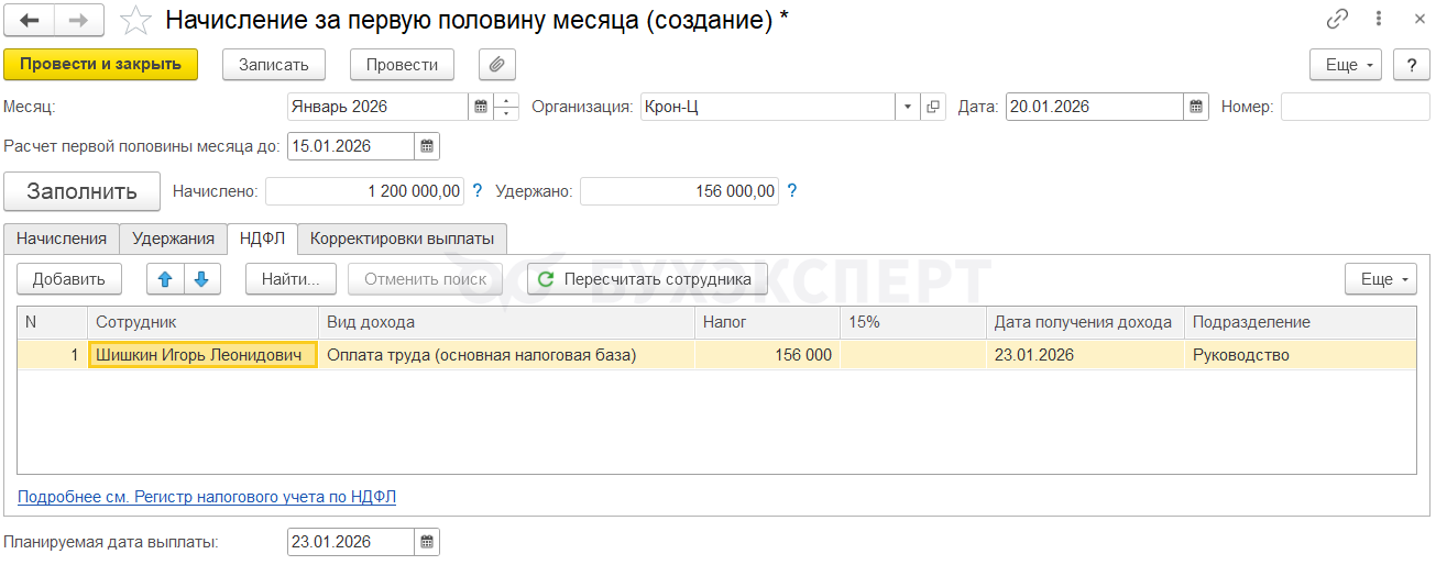 Т. к. зарплата за вторую половину декабря относится к доходам 2026 года, то после начисления январского аванса у сотрудника будет превышен предел дохода в 2,4 млн руб. Поэтому в январе часть доходов Шишкина И. Л. будет облагаться уже по ставке 15%.