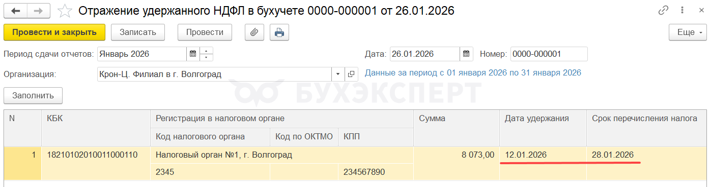 - Если зарплата за декабрь 2025 выплачена в январе 2026, срок уплаты налога будет попадать на 28.01.2026. Уведомление в ФНС нужно отправить не позднее 26.01.2026. В ЗУП 3.1 налог, удержанный с декабрьской зарплаты в январе 2026, попадет в Отражение удержанного НДФЛ за январь 2026