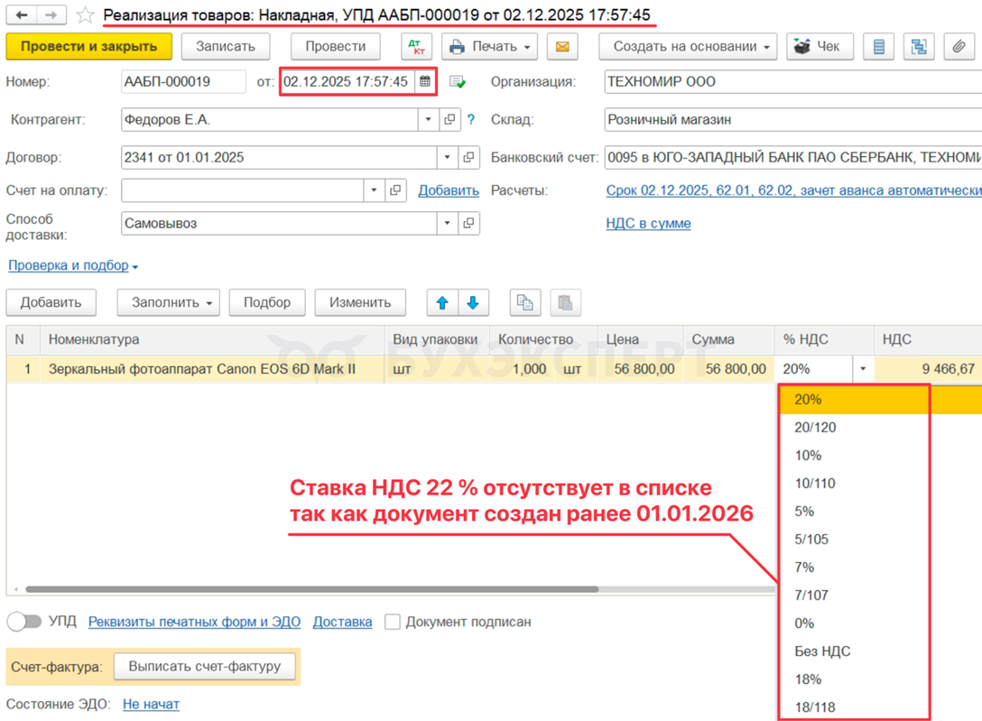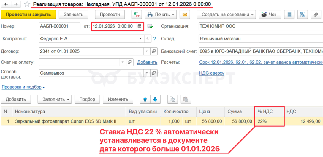 Ставка НДС 22% автоматически устанавливается в документах, формируемых после 01.01.2026.