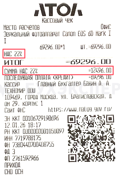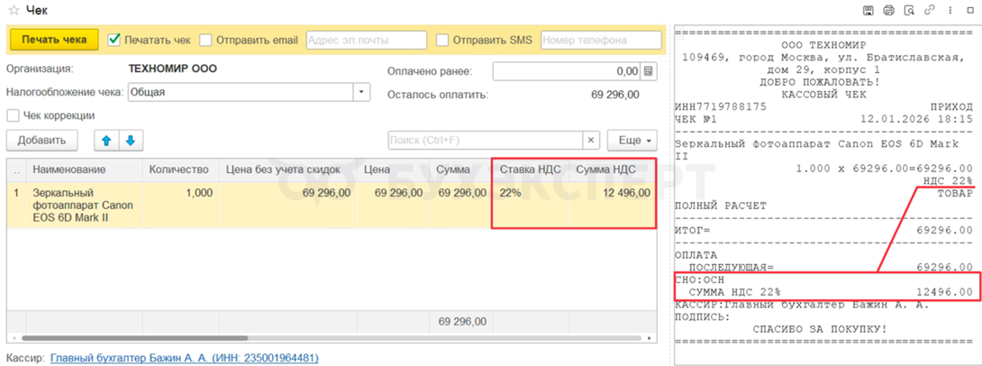 Онлайн-ККТ произведет печать чека со ставкой НДС 22%.