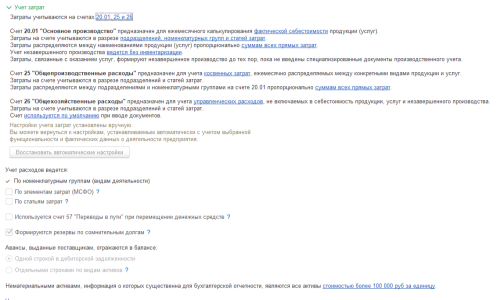 Добрый день. Наша организация использует при отражении выручки документ Реализация (акт, накладная, УПД). При этом 20 счет не списывается. Не можем убрать надпись «Затраты, связанные с оказанием услуг, формируют незавершенное производство до тех пор, пока не введены специализированные документы производственного учета» указанным в статье и комментарии способом. Как еще можно убрать эту настройку?