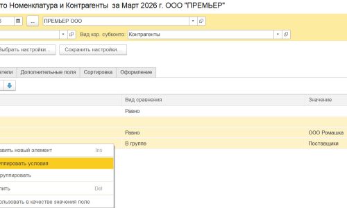 Выделите обе строки Кор.Контрагенты, по щелчку правой кнопкой мыши на выделенных строках из контекстного меню выберите команду Сгруппировать условия — Группа Или.