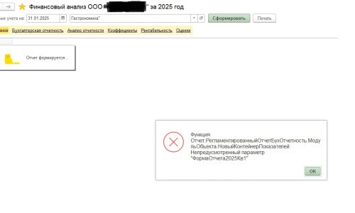 При формировании отчета Финансовый анализ в 2025 году выдается сообщение об ошибке «Непредусмотренный параметр «ФормаОтчета2025Кв1″»