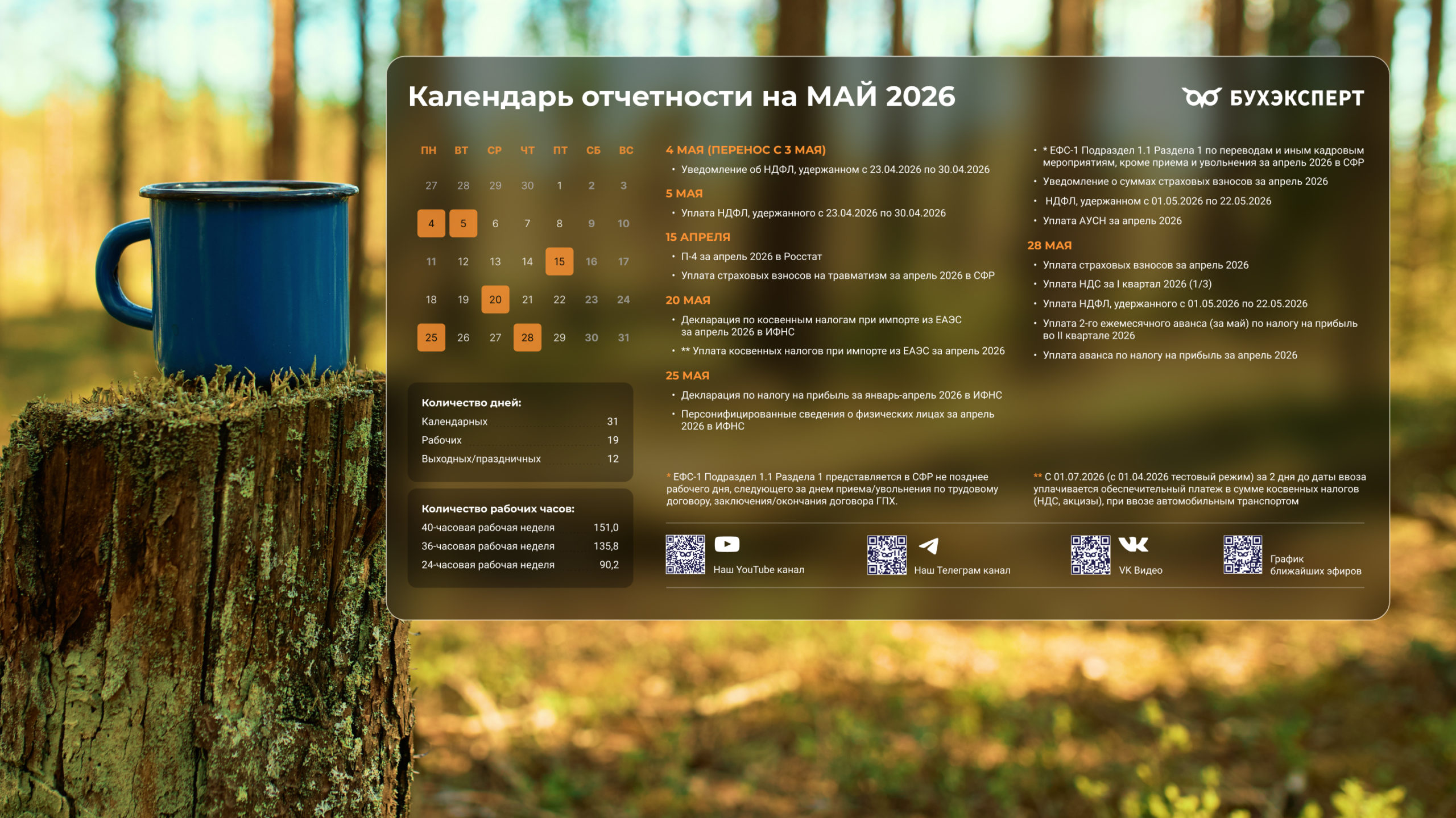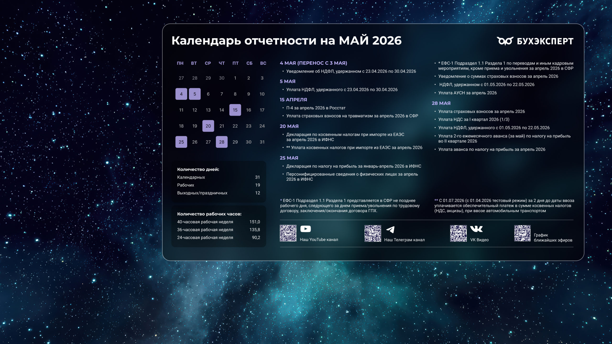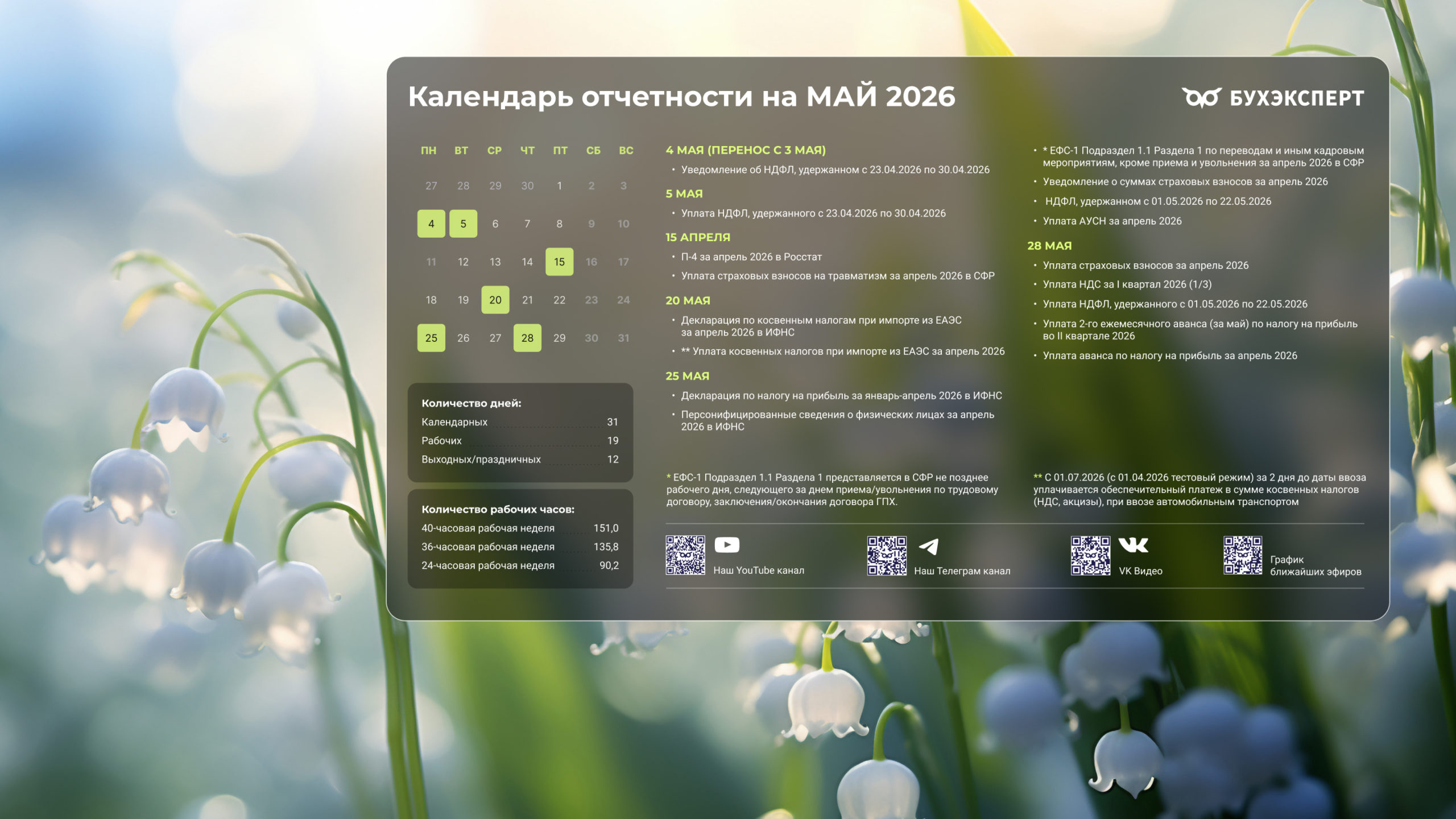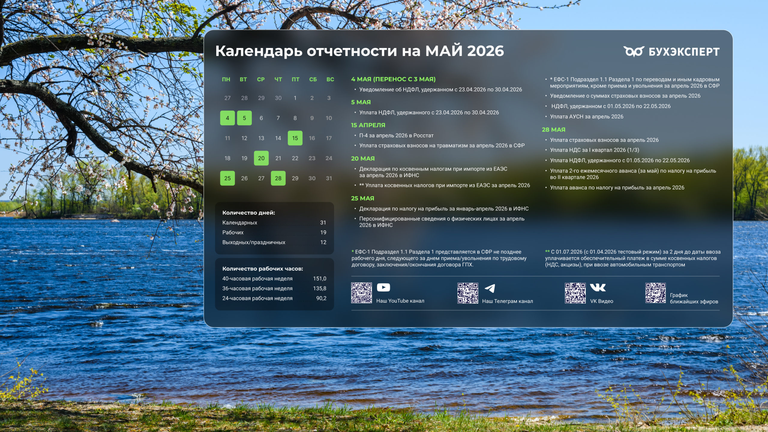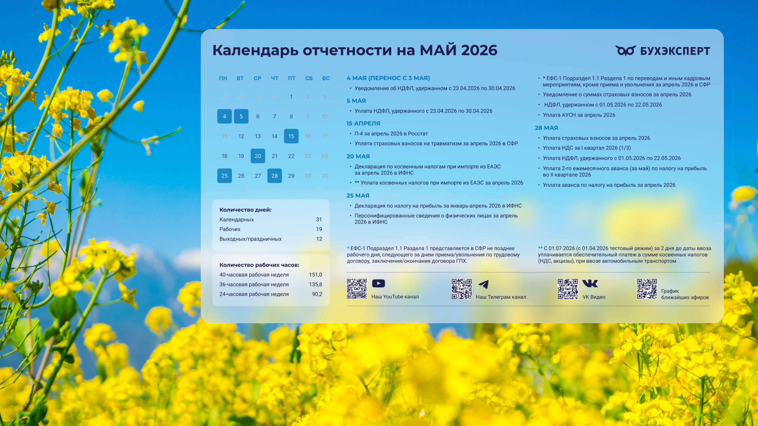от команды Бухэксперт специально для бухгалтеровПоставив обои на рабочий стол, вы сможете всегда иметь перед глазами календарь с датами сдачи отчетности и перечисления платежей в бюджет. Кроме того, на обоях указаны выходные и праздничные дни, а также количество рабочих дней и часов, чтобы вам удобнее было заполнять табель и рассчитывать зарплату сотрудникам.