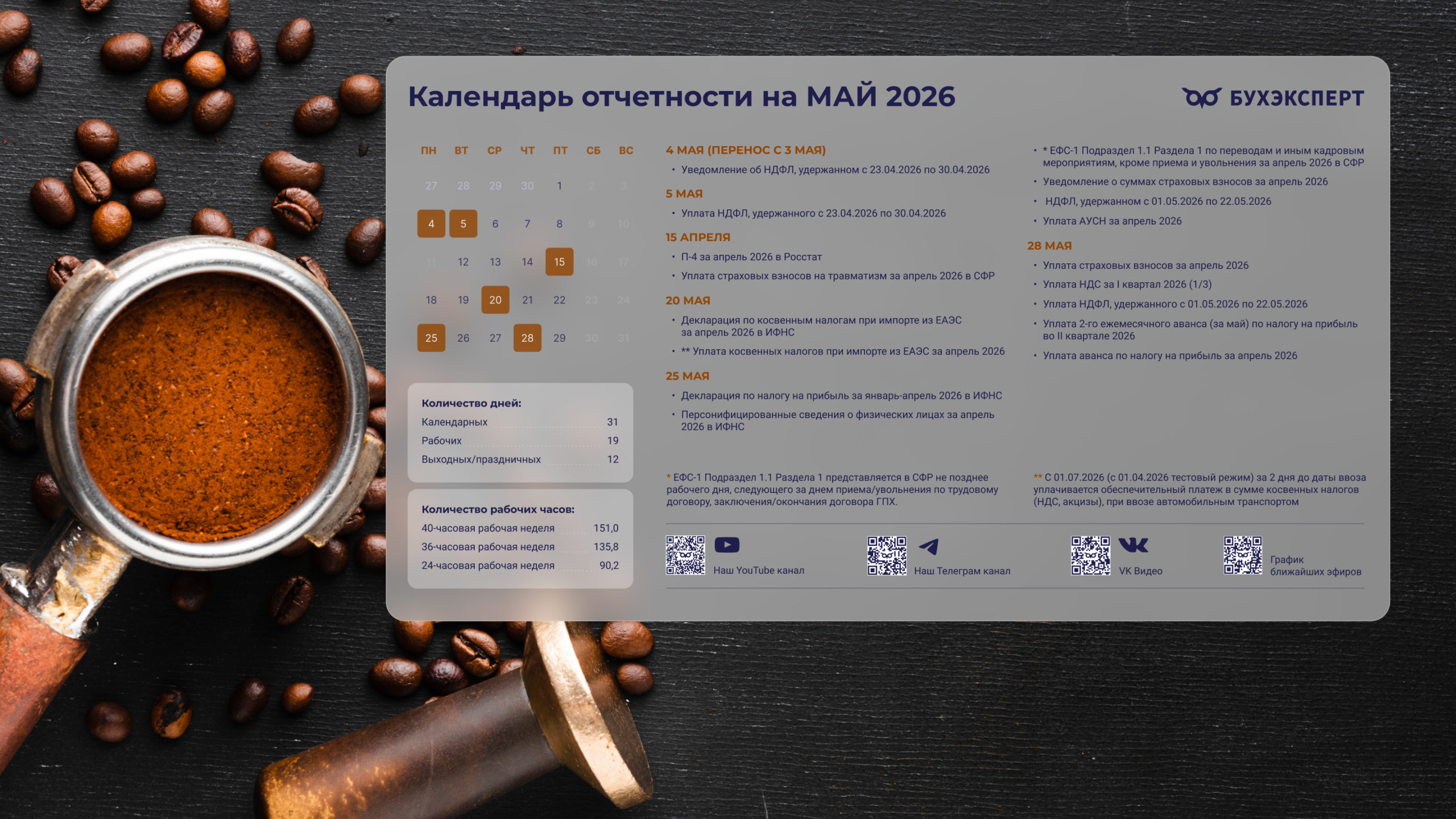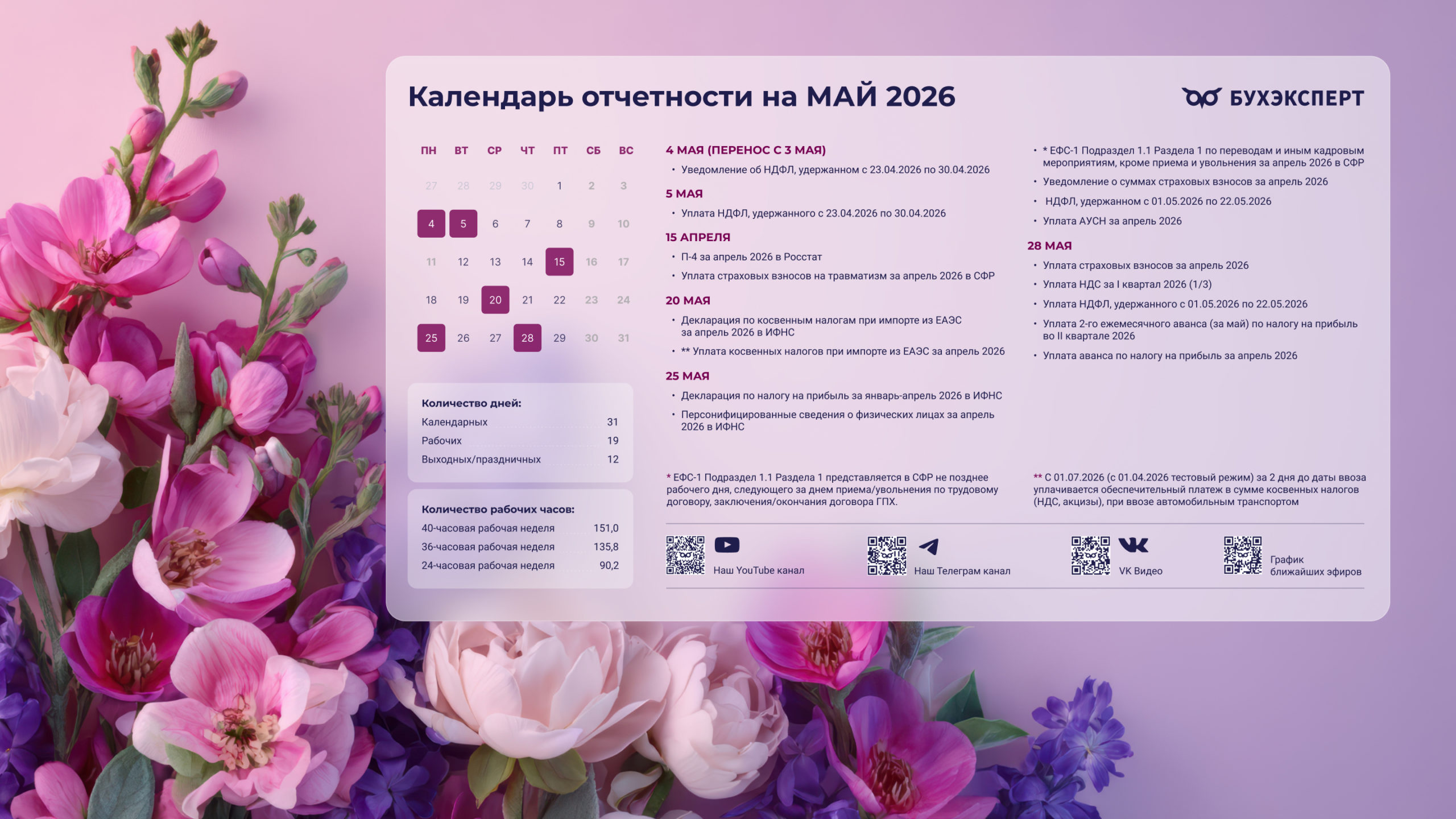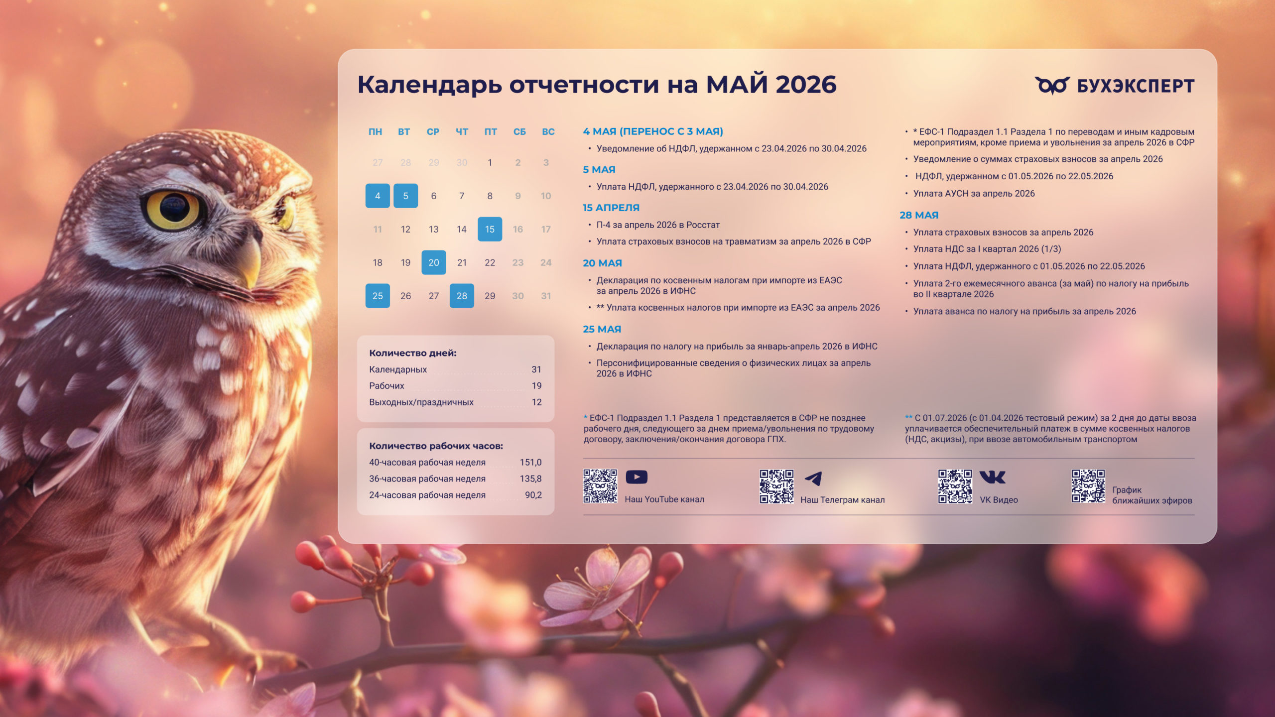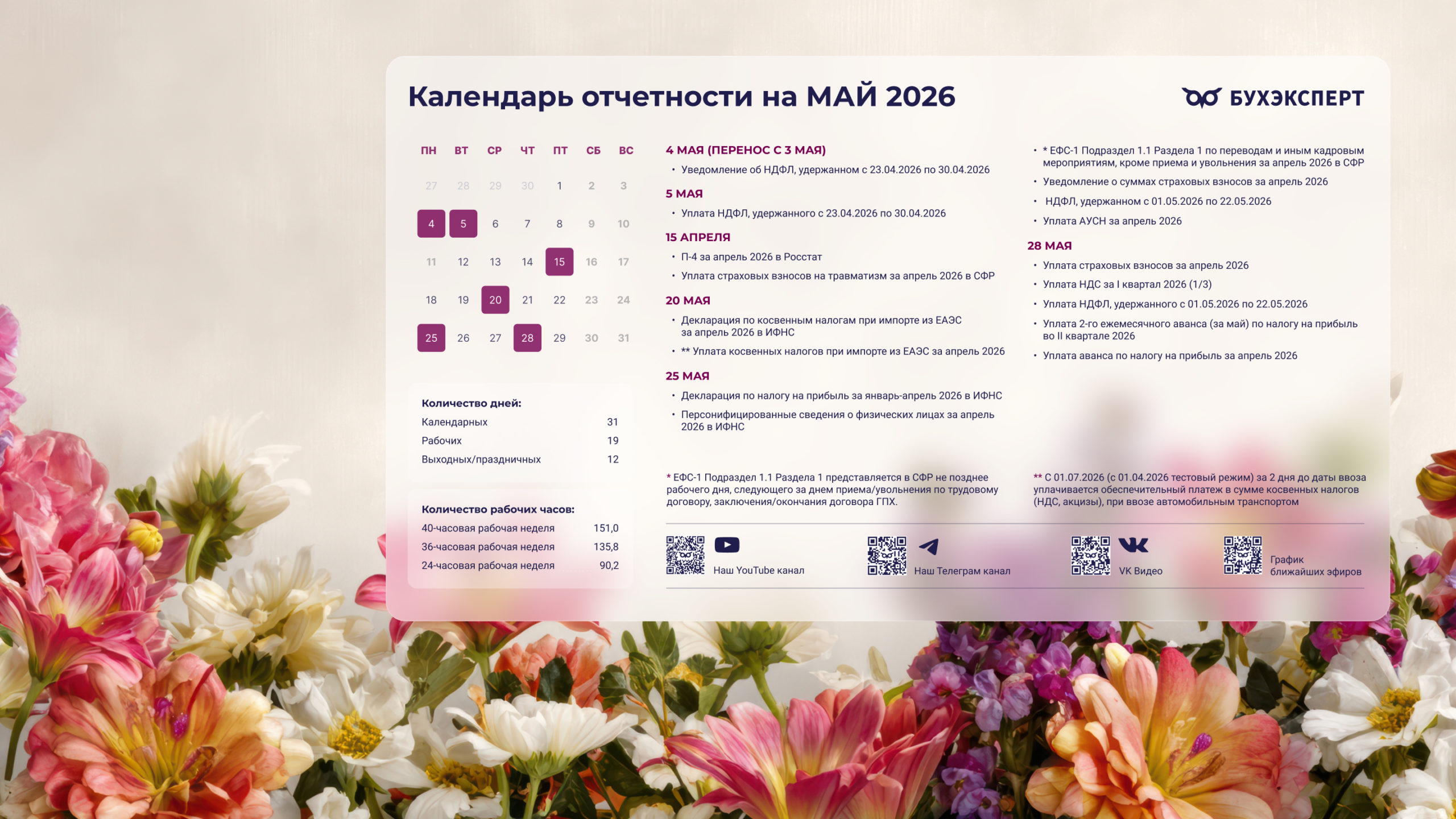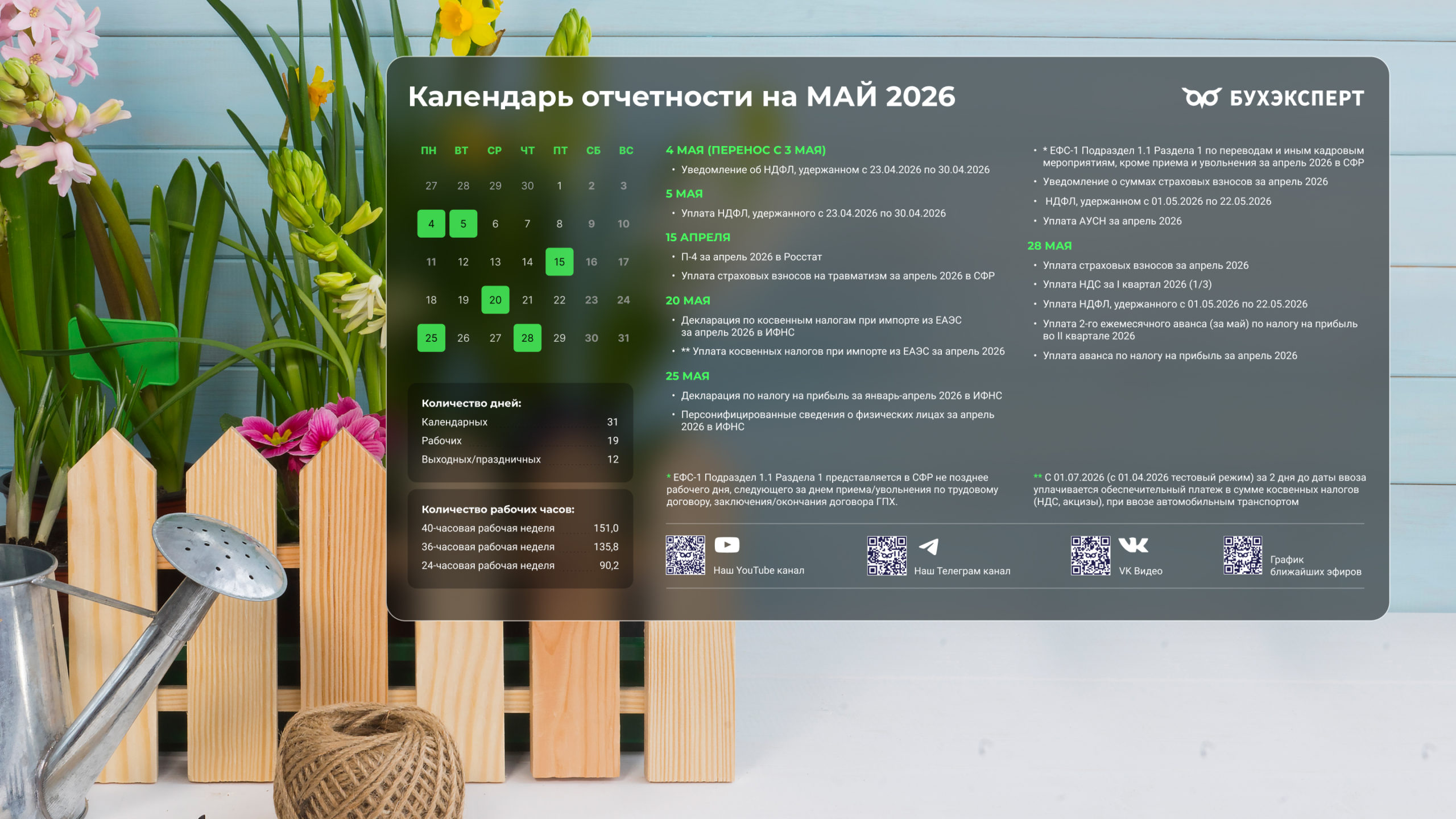 от команды Бухэксперт специально для бухгалтеровПоставив обои на рабочий стол, вы сможете всегда иметь перед глазами календарь с датами сдачи отчетности и перечисления платежей в бюджет. Кроме того, на обоях указаны выходные и праздничные дни, а также количество рабочих дней и часов, чтобы вам удобнее было заполнять табель и рассчитывать зарплату сотрудникам.