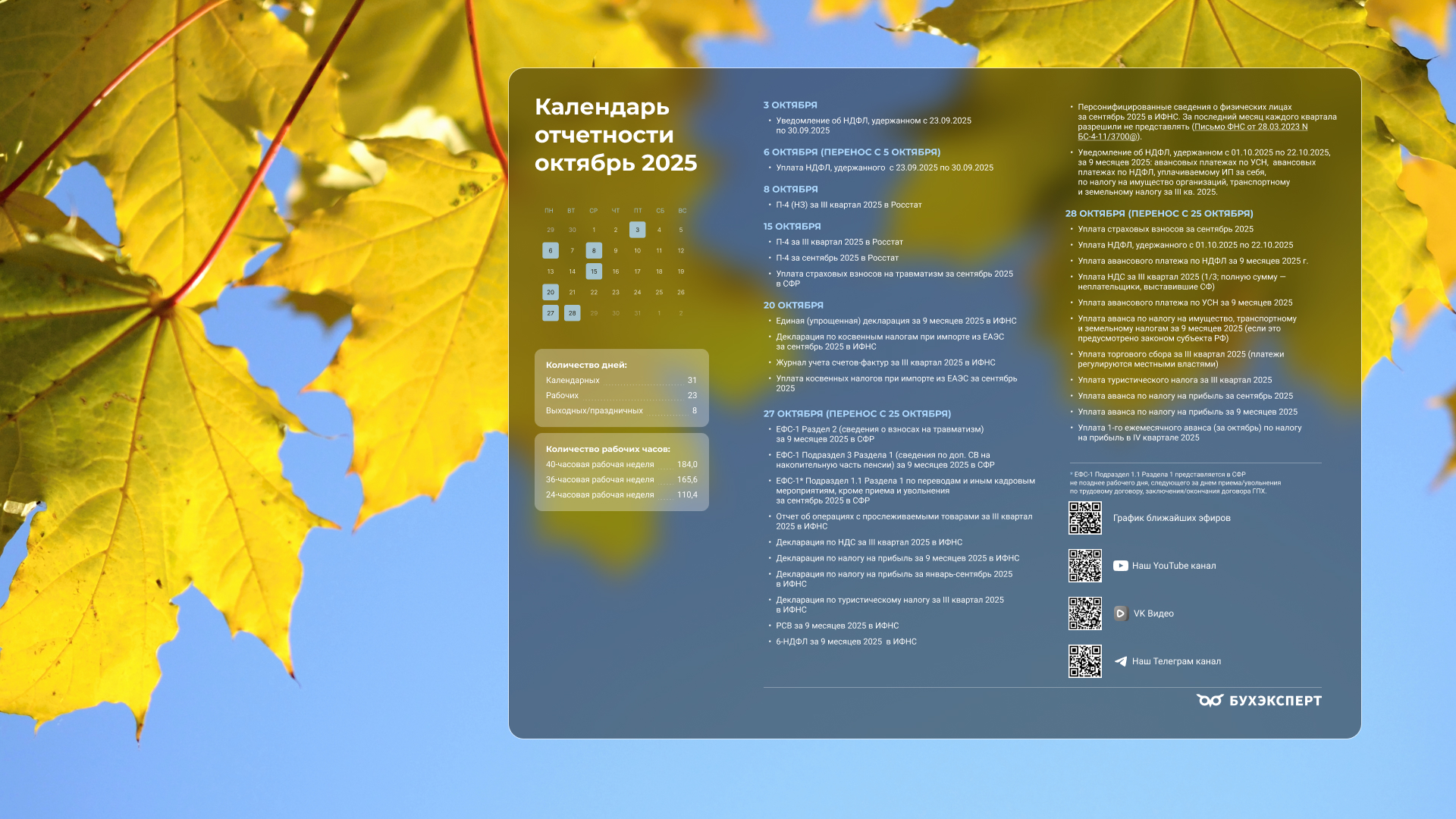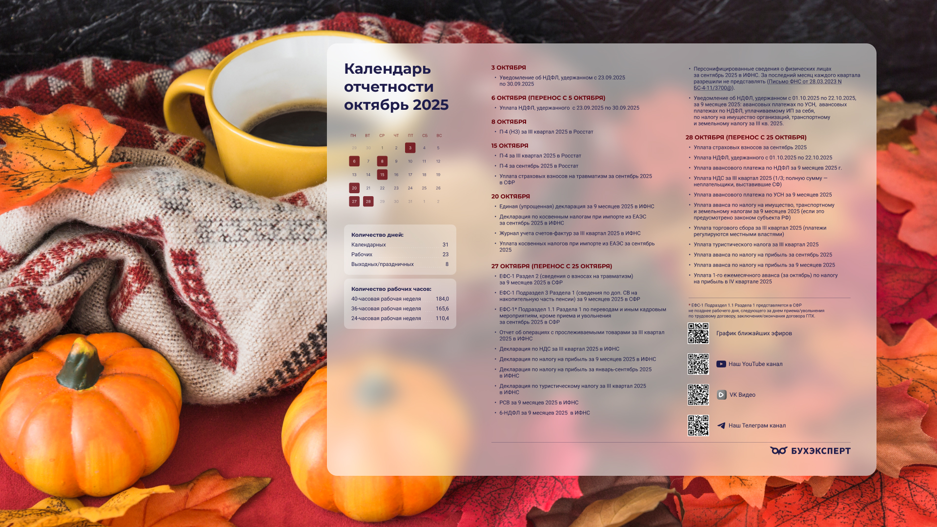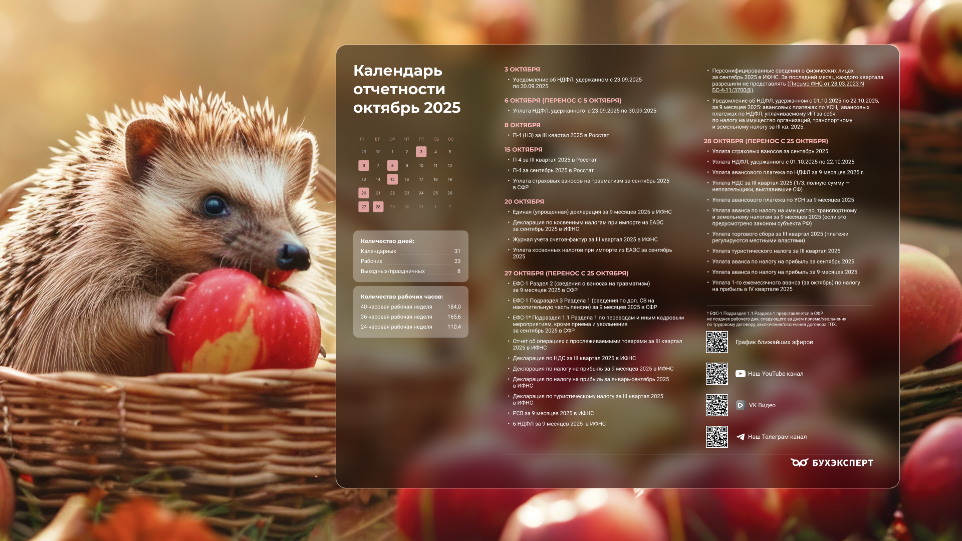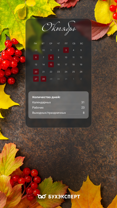 от команды Бухэксперт специально для бухгалтеровПоставив обои на рабочий стол, вы сможете всегда иметь перед глазами календарь с датами сдачи отчетности и перечисления платежей в бюджет. Кроме того, на обоях указаны выходные и праздничные дни, а также количество рабочих дней и часов, чтобы вам удобнее было заполнять табель и рассчитывать зарплату сотрудникам.