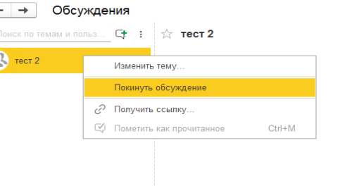 По команде Покинуть обсуждение можно выйти из темы. Участник, покинувший тему, больше не будет видеть ее в 1С, но сама тема бессрочно сохраняется на сервере взаимодействия.