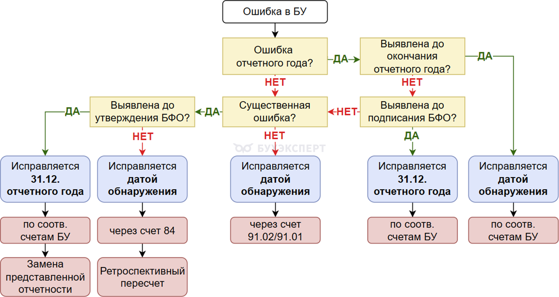 Схема поможет определиться какой датой исправить ошибку в БУ и по каким счетам скорректировать учет.