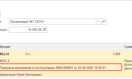 - Операция — документ Операция, введенная вручную с проводками передачи находящихся в эксплуатации ТМЦ с МОЛ (от кого) на МОЛ (кому);