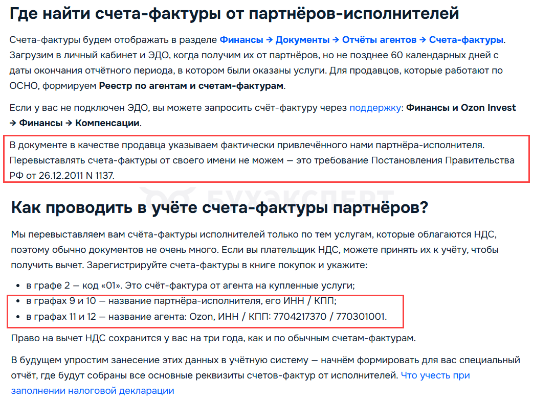 Добрый день! Нет, у нас именно Озон выставляет отчет об исполнении поручений, где он указан как агент, исполнители — разные ИП и ООО, услуга — «перевыставление услуг последней мили». Счет-фактуры по этим услугам с НДС тоже присылает и подписывает ОЗОН (в ЭДО), а продавец там указан уже другой.