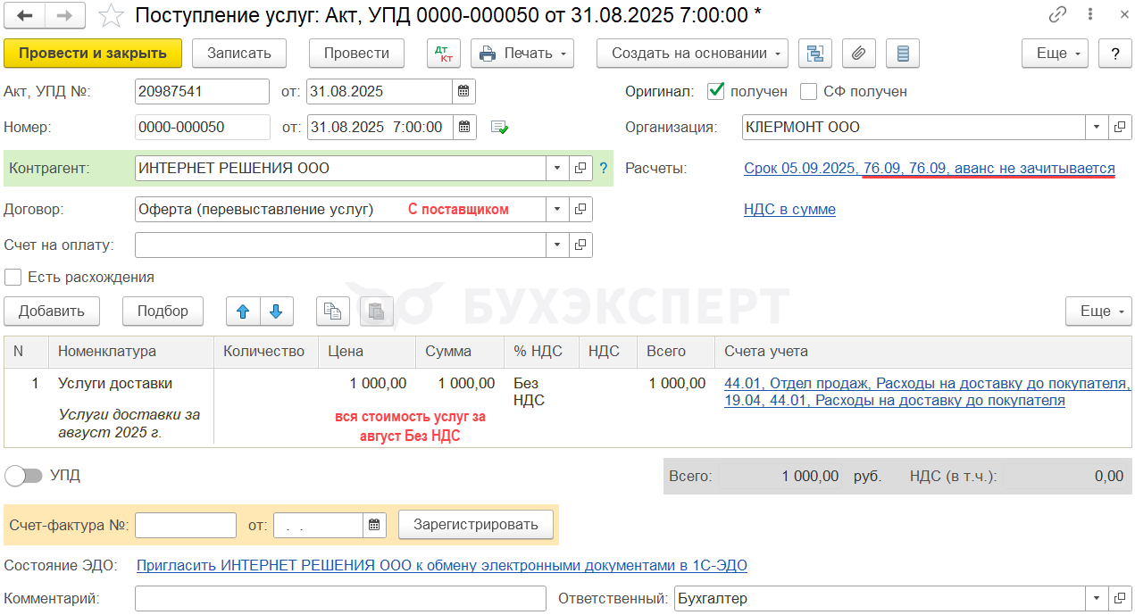 Для отражения в 1С услуг без НДС — всей суммы по отчету — создайте документ Поступление (акт, накладная, УПД) вид операции Услуги в разделе Покупки — Поступления (акты, накладные, УПД).