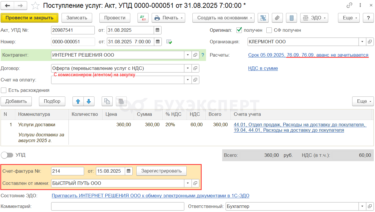 По ОСНО — а можно проводить УПД с контрагентом «Озон» по агентскому договору и указывать, что счет-фактура составлен от имени ООО «Быстрый путь»? Ведь акт на все эти услуги последней мили выставляет Озон? У нас, например, 150 позиций в этом акте, из них только 5 с НДС.