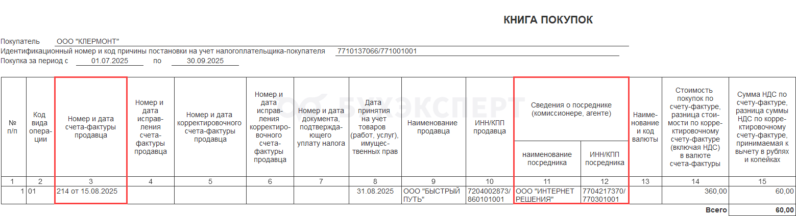 В отчете Книга покупок (раздел Отчеты) отразится: