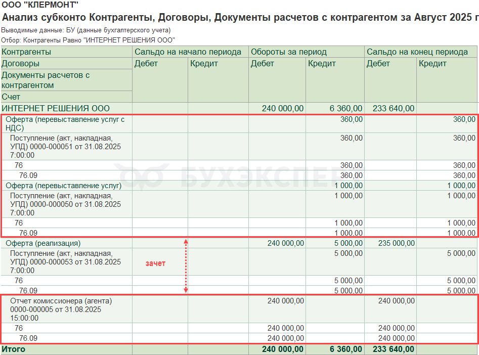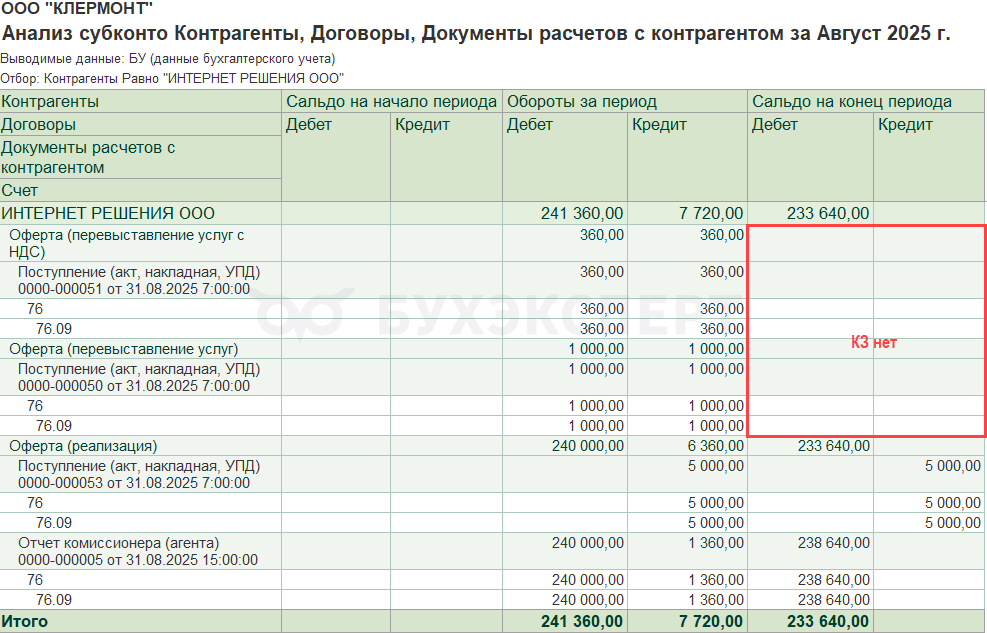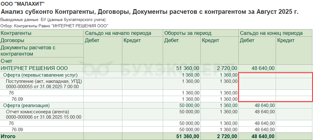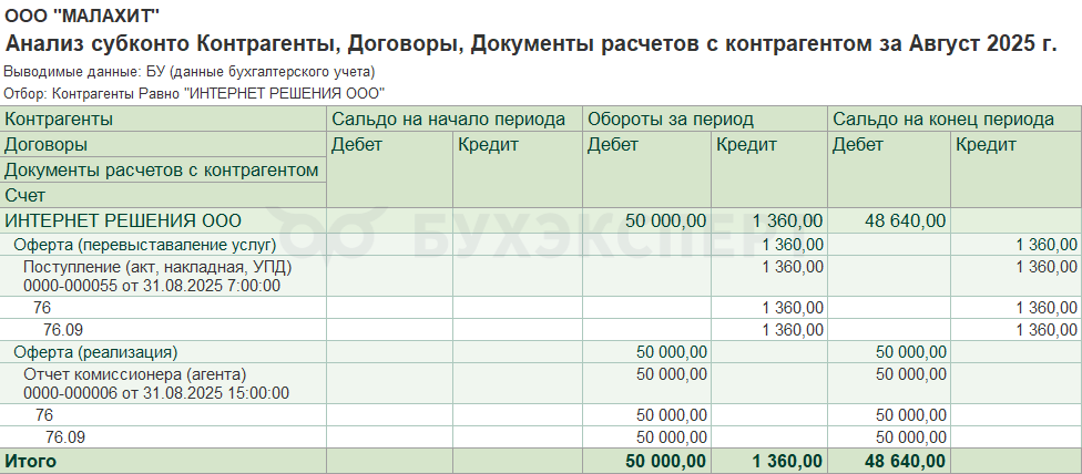 Проверьте состояние расчетов с торговой площадкой и поставщиками услуг доставки — в разрезе договоров и документов расчетов. Используйте отчет Анализ субконто с отбором по контрагентам в разделе Отчеты.