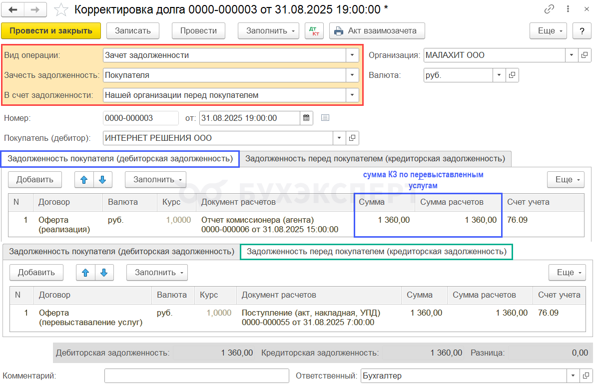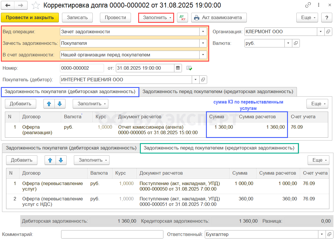 - на вкладке Задолженность перед покупателем (кредиторская задолженность) — только строки по перевыставленным услугам, которые нужно зачесть. Можно этим же документом зачесть другую КЗ перед МП при наличии, например, вознаграждение