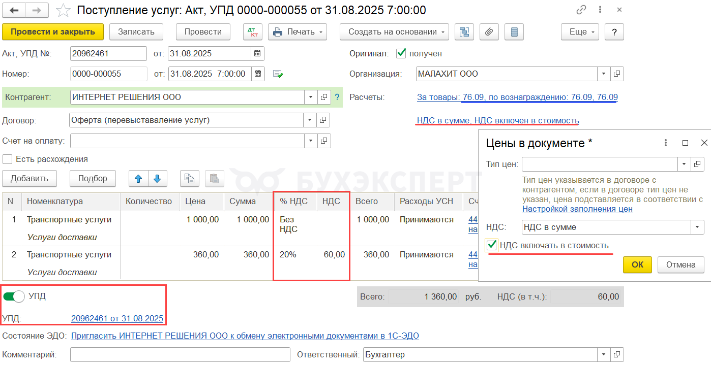 - Цены в документе — флажок НДС включать в стоимость установлен