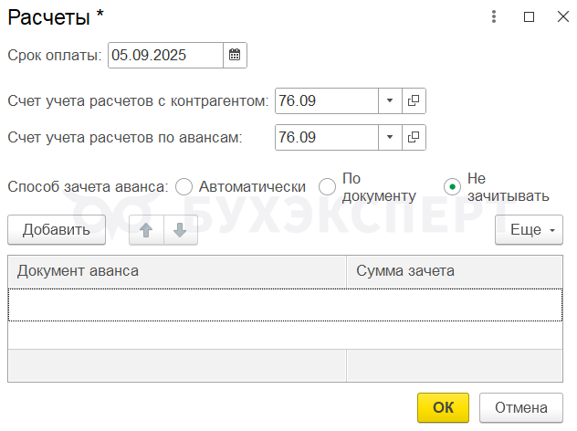 - Способ зачета аванса — Не зачитывать, чтобы провести зачет задолженности вручную