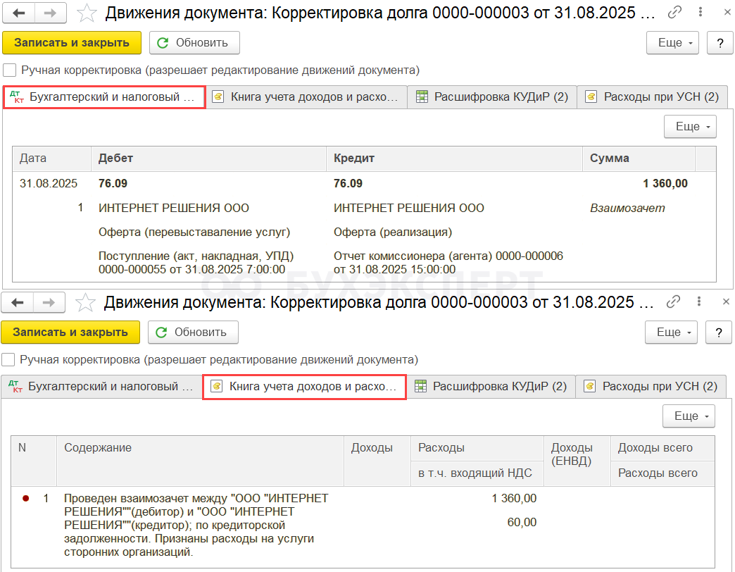 Документ формирует проводку по зачету дебиторской и кредиторской задолженности по разным договорам и запись по расходам УСН на услуги и НДС.
