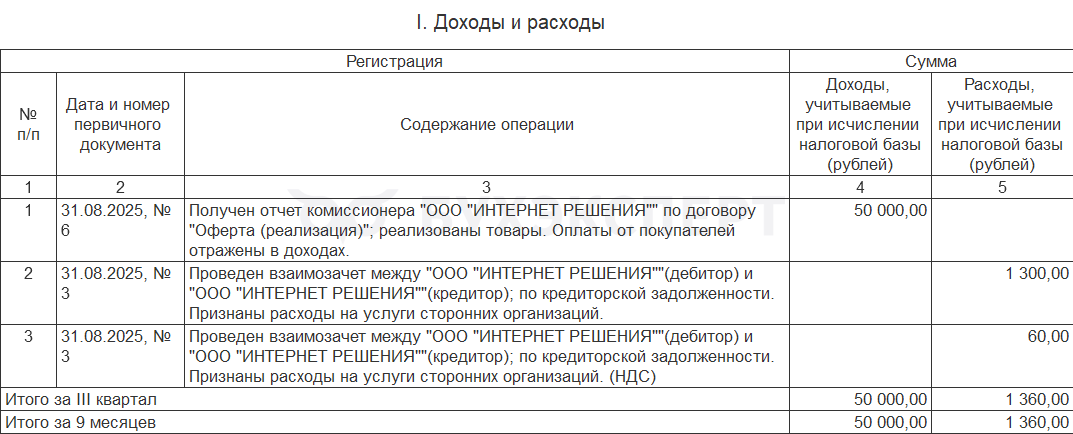В КУДиР итоговые суммы дохода и расхода складываются верные. Наименование организации-исполнителя в КУДиР не отображается, т. к. расчеты проведены через Озон. При необходимости эту информацию можно внести в ручном режиме. Например, в файле, сохраненном в Excel. Или приложить Отчет «Озона» как расшифровку данной информации.