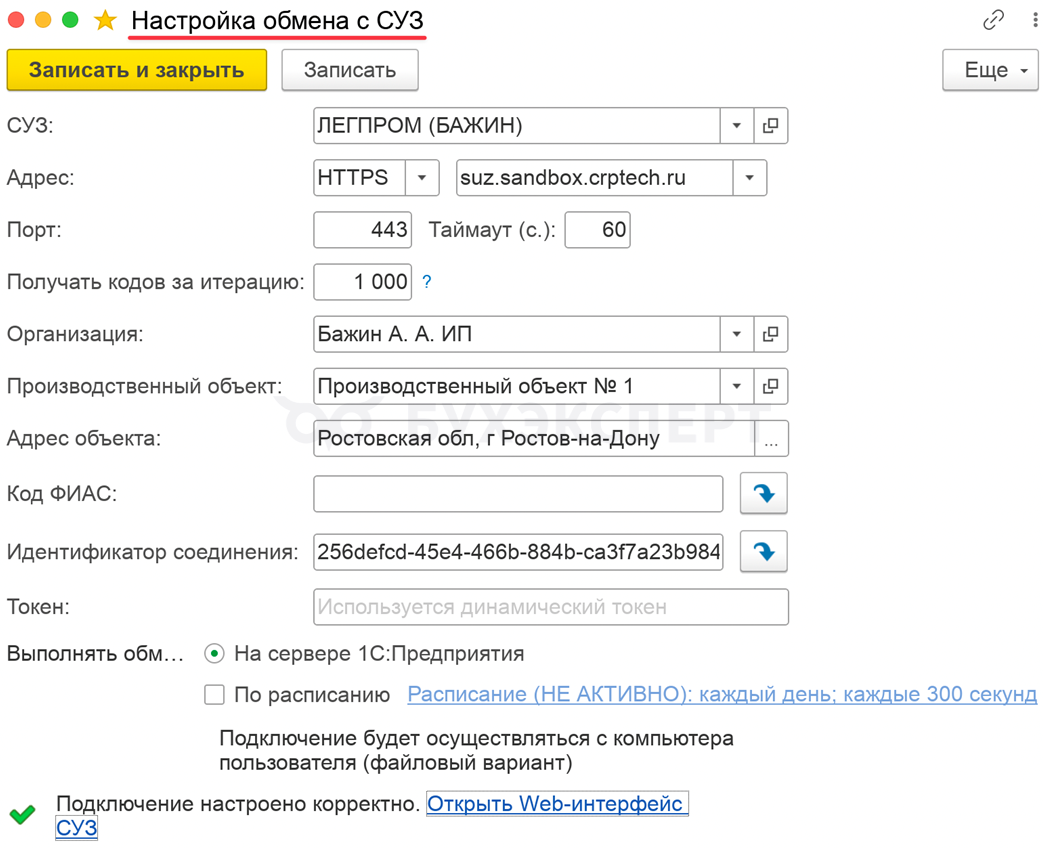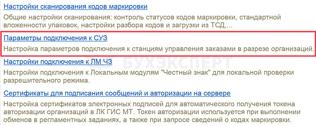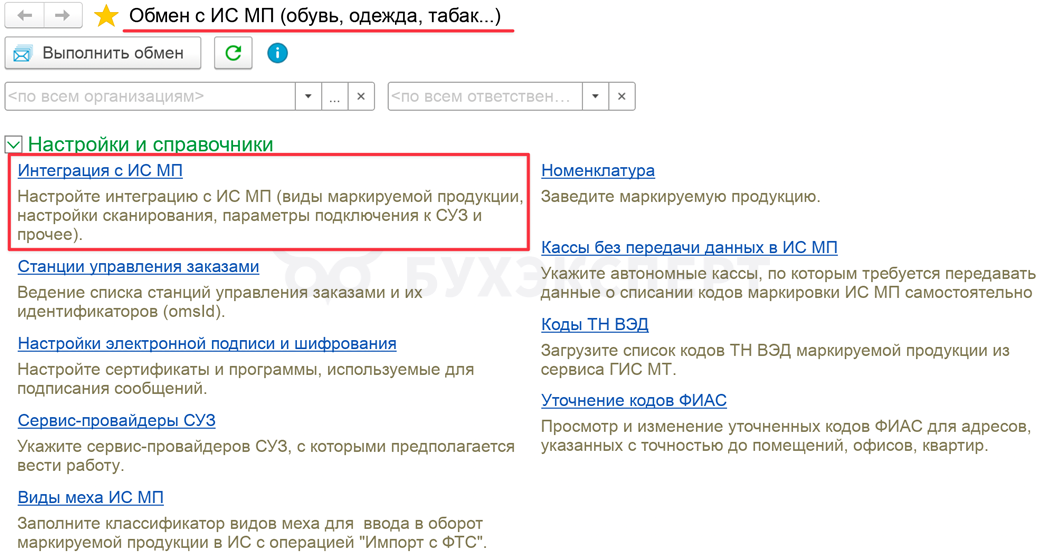В этом же помощнике настраивается взаимодействие с Честным знаком через меню Настройки и справочники — Интеграция с ИС МП — Параметры подключения к СУЗ.