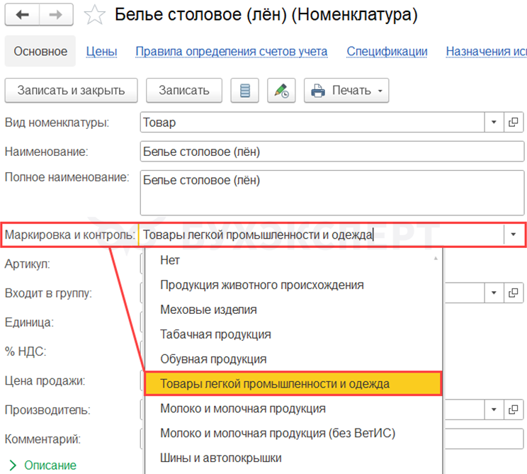 Для маркировки товаров в 1С нужно настроить справочник Номенклатура. Если товар маркируемый, то в его карточке необходимо указать признак отнесения к определенной группе маркируемой продукции. За это отвечает настройка Маркировка и контроль.
