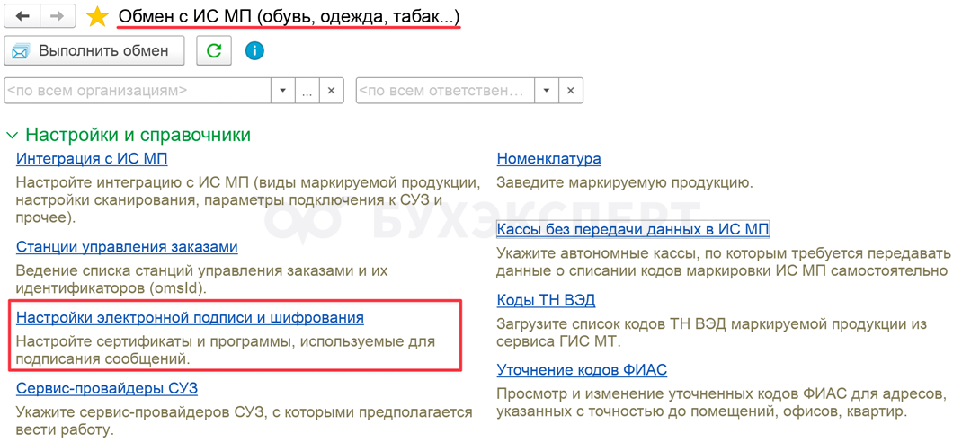 Для включения возможности подписи документов квалифицированной электронной подписью внесите сертификат пользователя через панель Обмен с ИС МП (одежда, обувь, табак) и пункт Настройки электронной подписи и шифрования.