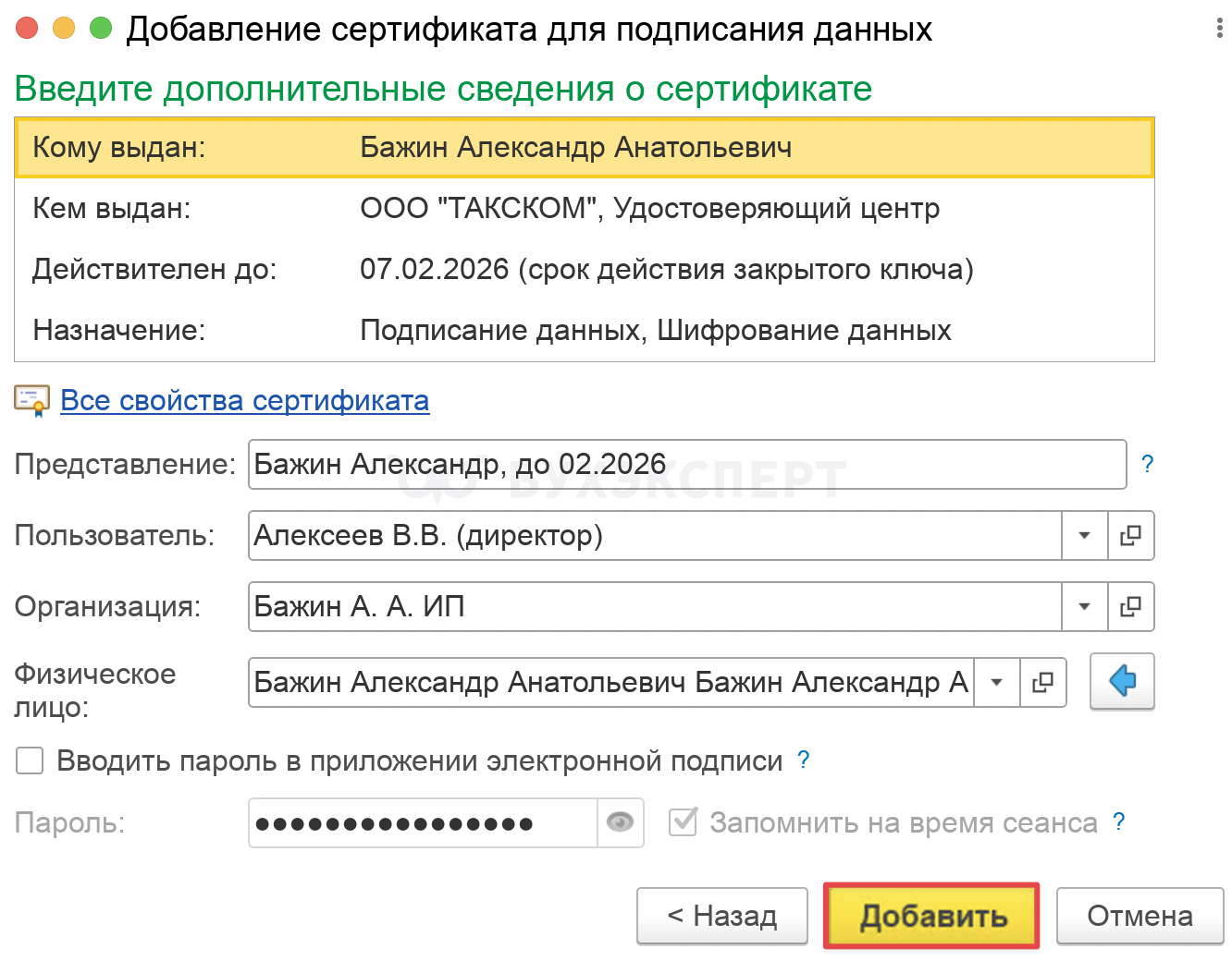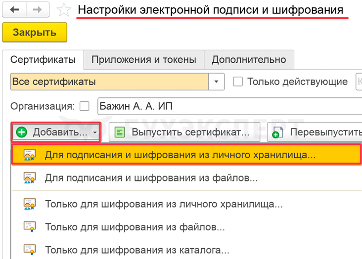 По кнопке Добавить — Для подписания и шифрования из личного хранилища выберите квалифицированный сертификат и нажмите Далее.