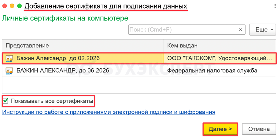 Сертификат добавится в список доступных сертификатов для подписания документов.
