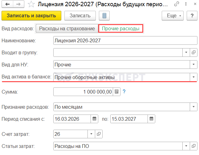- Прочие оборотные активы (стр. 1260) — неисключительное право на ПО сроком до 1 года, признанное прочим активом