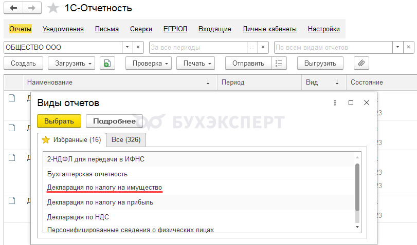 Где найти декларацию по налогу на имущество в 1С 8.3