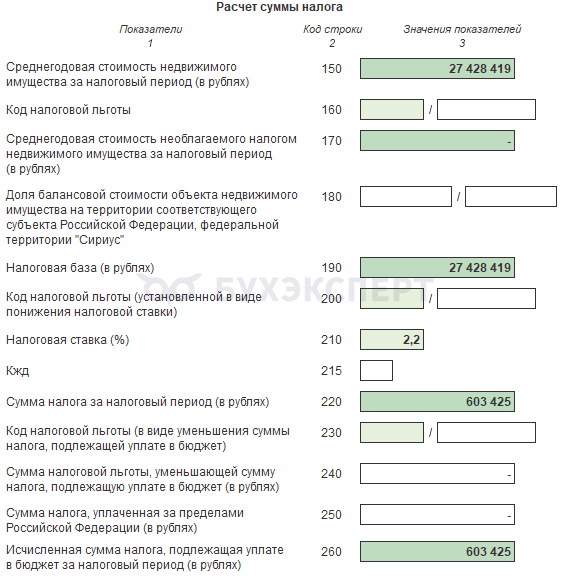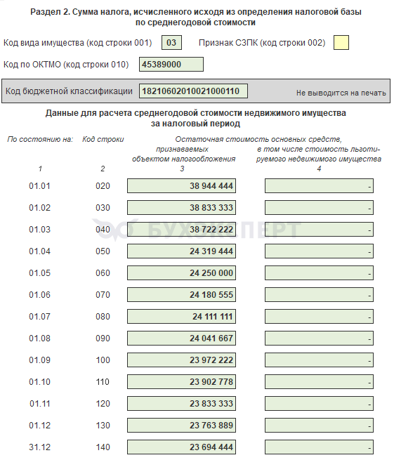 В Разделе 2 отражается исчисленный налог на имущество по недвижимости, облагаемой по среднегодовой стоимости. Раздел 2 полностью автозаполняемый.