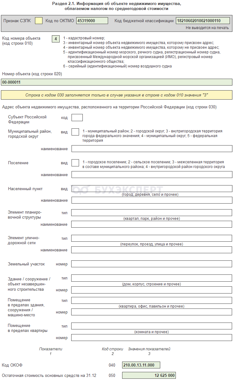 Раздел 2.1 — сведения по каждому отдельному объекту недвижимости, облагаемому по среднегодовой стоимости. Сколько объектов — столько листов Раздела 2.1.
