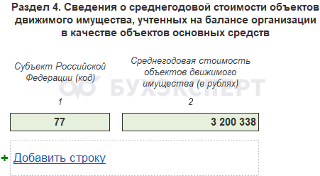 В Разделе 4 отражаются сведения о среднегодовой стоимости движимого имущества по субъектам РФ. В 1С Бухгалтерия 8 Раздел 4 заполняется автоматически.