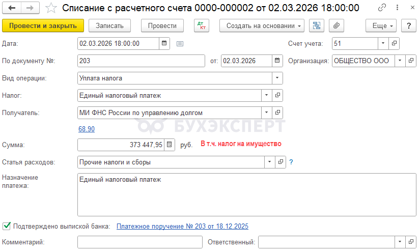 Налог на имущество уплачивается в составе ЕНП — до 02.03.2026 (перенос с 28.02.2026) (п. 1 ст. 363 НК РФ).