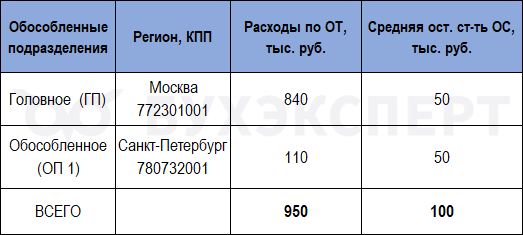 В нашем примере доля остаточной стоимости ОС в обособленном подразделении и ГП — по 50%.