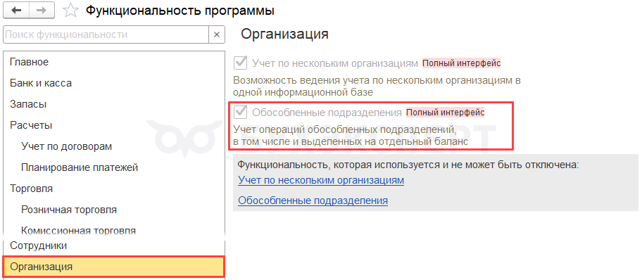 Чтобы в 1С стал возможным учет с ОП, настройте функциональность программы. Через Главное — Функциональность — Организация установите флаг Обособленные подразделения.