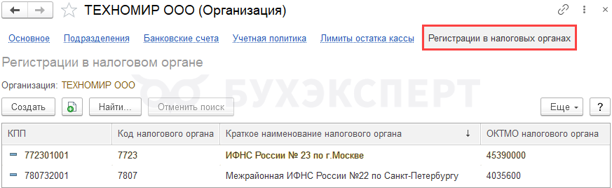 Каждое обособленное подразделение должно быть зарегистрировано в своем территориальном налоговом органе. В программе это отражается в справочнике Регистрации в налоговом органе (Главное – Организация – Регистрация в налоговых органах).