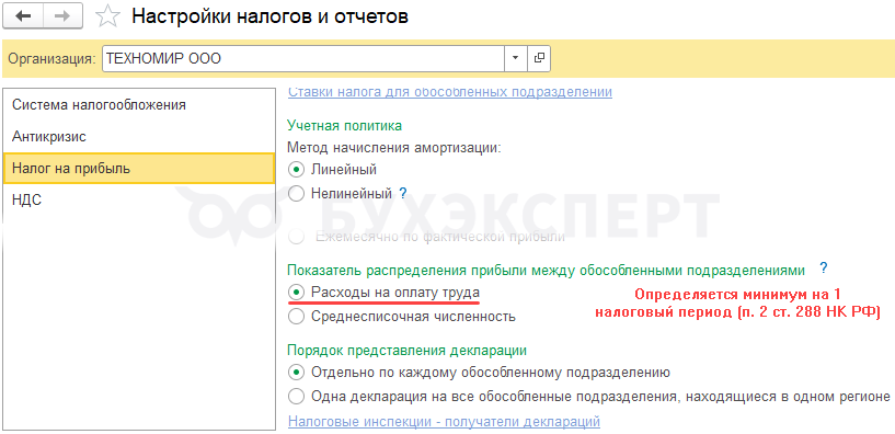 В настройках Налога на прибыль (Главное – Налоги и отчеты) выберите: