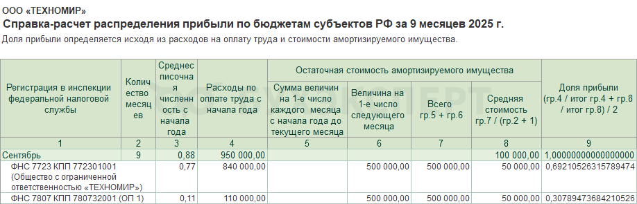 Расчет доли приведен в Справке-расчете распределения прибыли по бюджетам субъектов РФ (Операции – Закрытие месяца – Расчет налога на прибыль) за отчетный период.