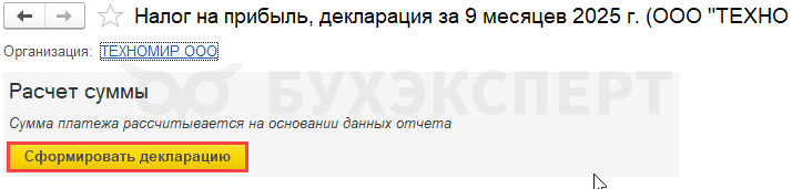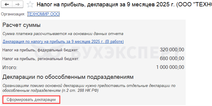 Сформируем декларацию по налогу на прибыль за 9 месяцев по организации и обособленному подразделению.