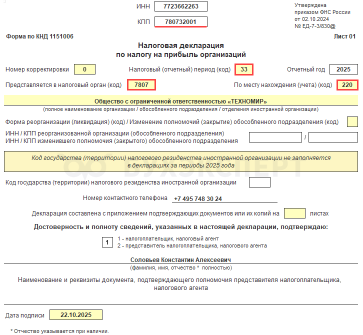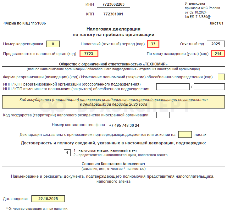 - Налоговый (отчетный) период (код) — в соответствии с настройками Порядка уплаты авансовых платежей (Главное – Налоги и отчеты – Налог на прибыль). В нашем примере применяется код 33 для организаций, представляющих декларации ежеквартально
