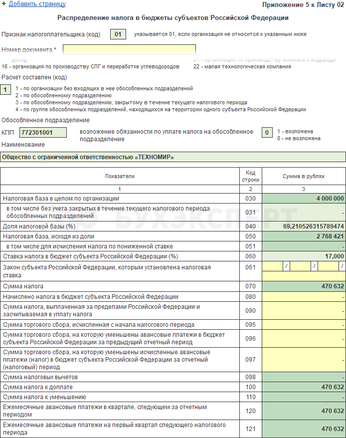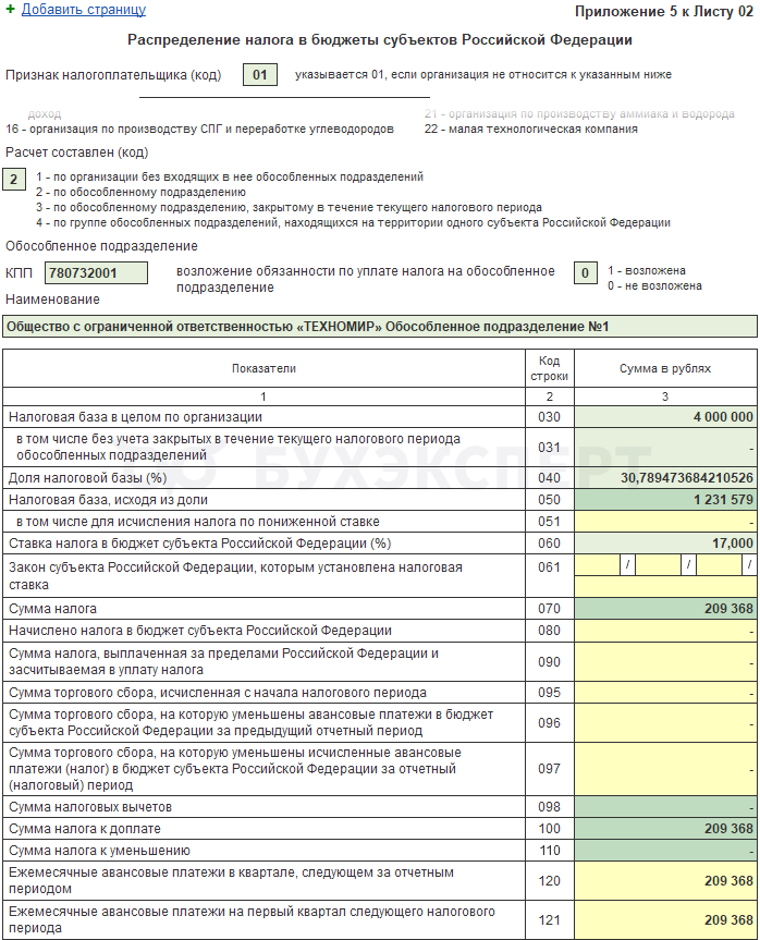 Далее налоговую базу распределим в соответствии с долей прибыли каждого ОП, включая головное, и умножим на ставку налога, установленную в субъекте РФ.